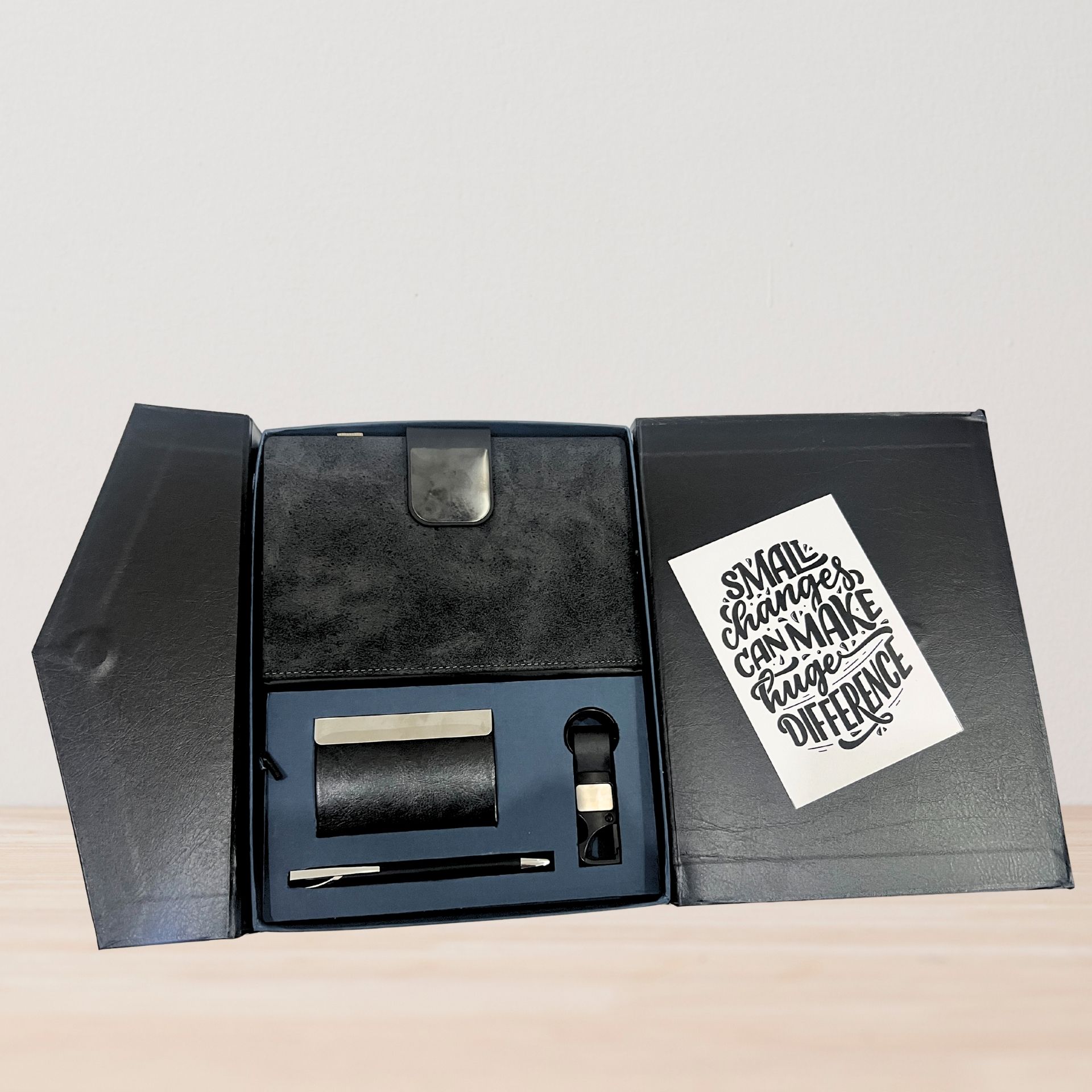 A premium corporate gifting solution designed for professionals who value style, utility, and class. Packed in a sleek black magnetic box, this set combines everyday office essentials with a polished executive look — making it an ideal choice for employee onboarding, client appreciation, corporate events, or festive gifting.
