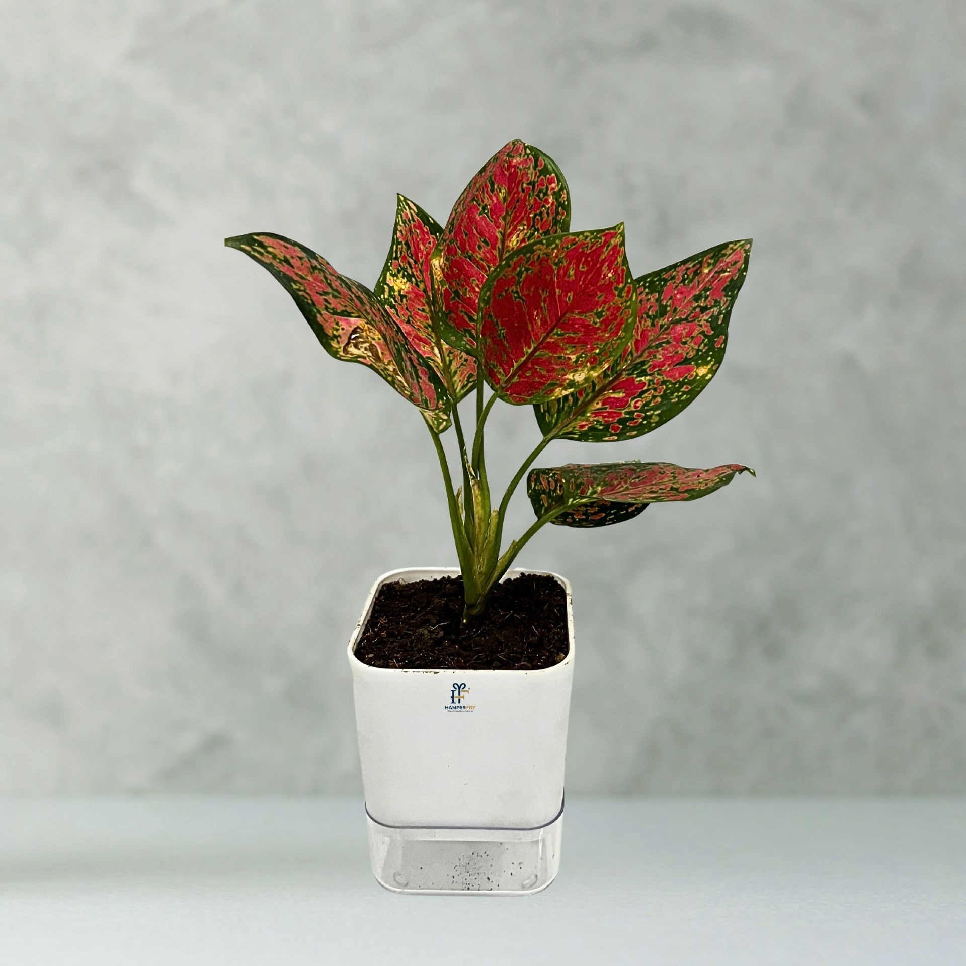 Add a vibrant splash of colour to any interior with the Aglaonema Pink Valentine Plant in a Self-Watering Planter. Known for its stunning pink and green variegated foliage, this ornamental indoor plant instantly brightens desks, homes, and office spaces.