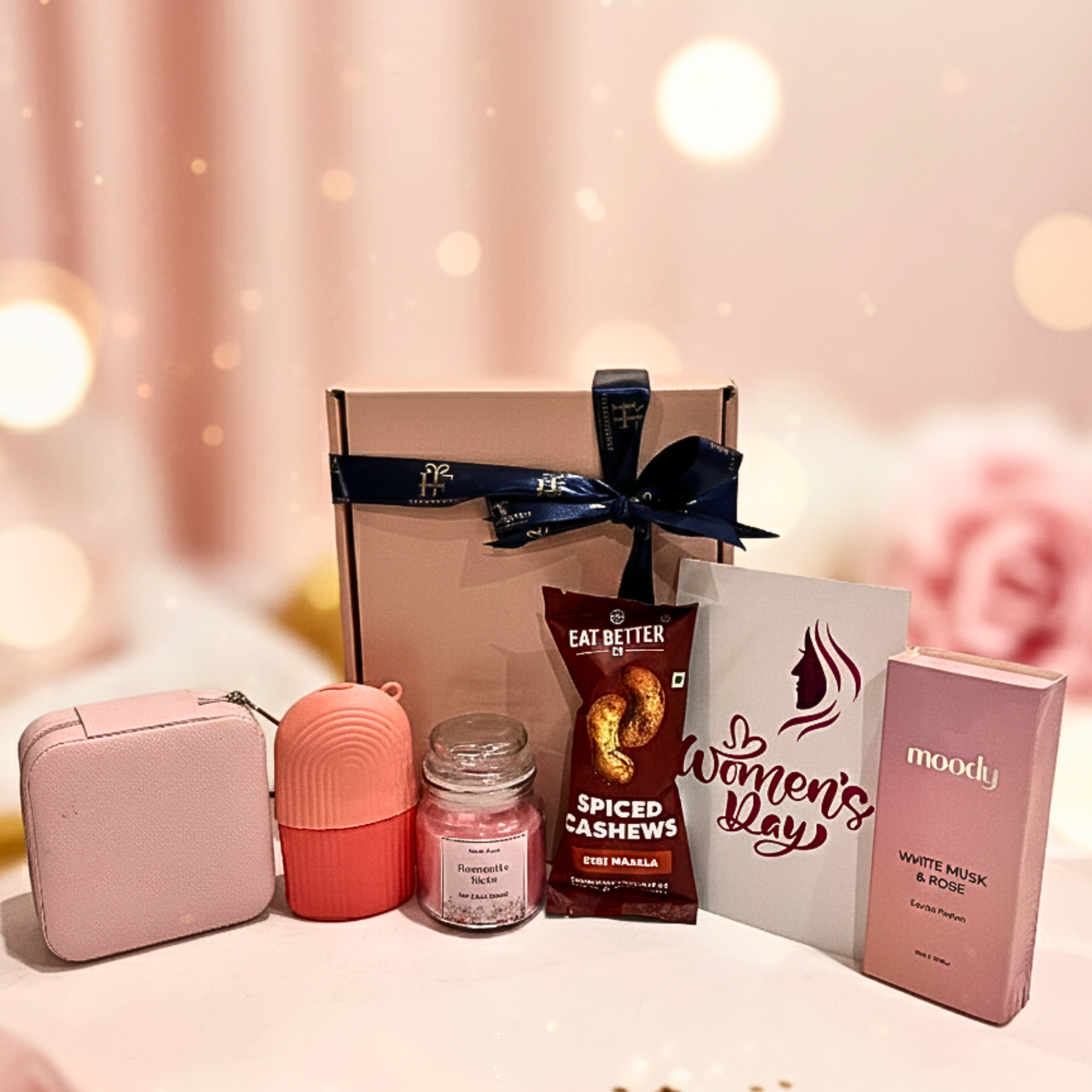 Women’s Day self-care gift hamper featuring a pink utility pouch, scented candle, insulated tumbler, Eat Better spiced cashews, White Musk & Rose perfume, and a Women’s Day greeting card. Ideal for corporate gifting, employee appreciation, and wellness-focused celebrations.