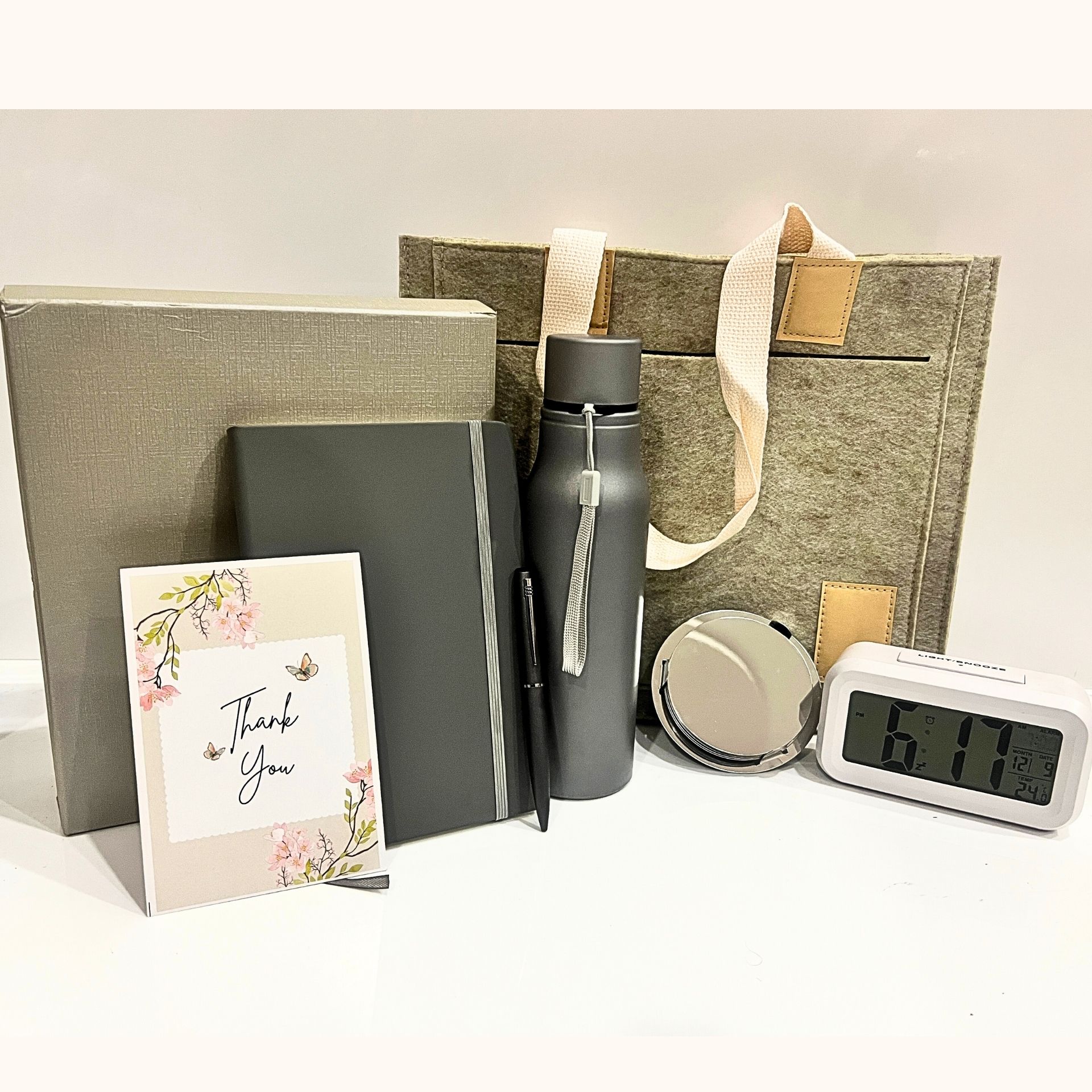 Elegant Grey Appreciation Corporate Hamper featuring a premium notebook, pen, matte grey steel bottle, LED digital clock, compact mirror, felt tote bag, and thank-you card. Perfect for corporate gifting, employee appreciation, onboarding kits, women’s day gifts, and client gifting.