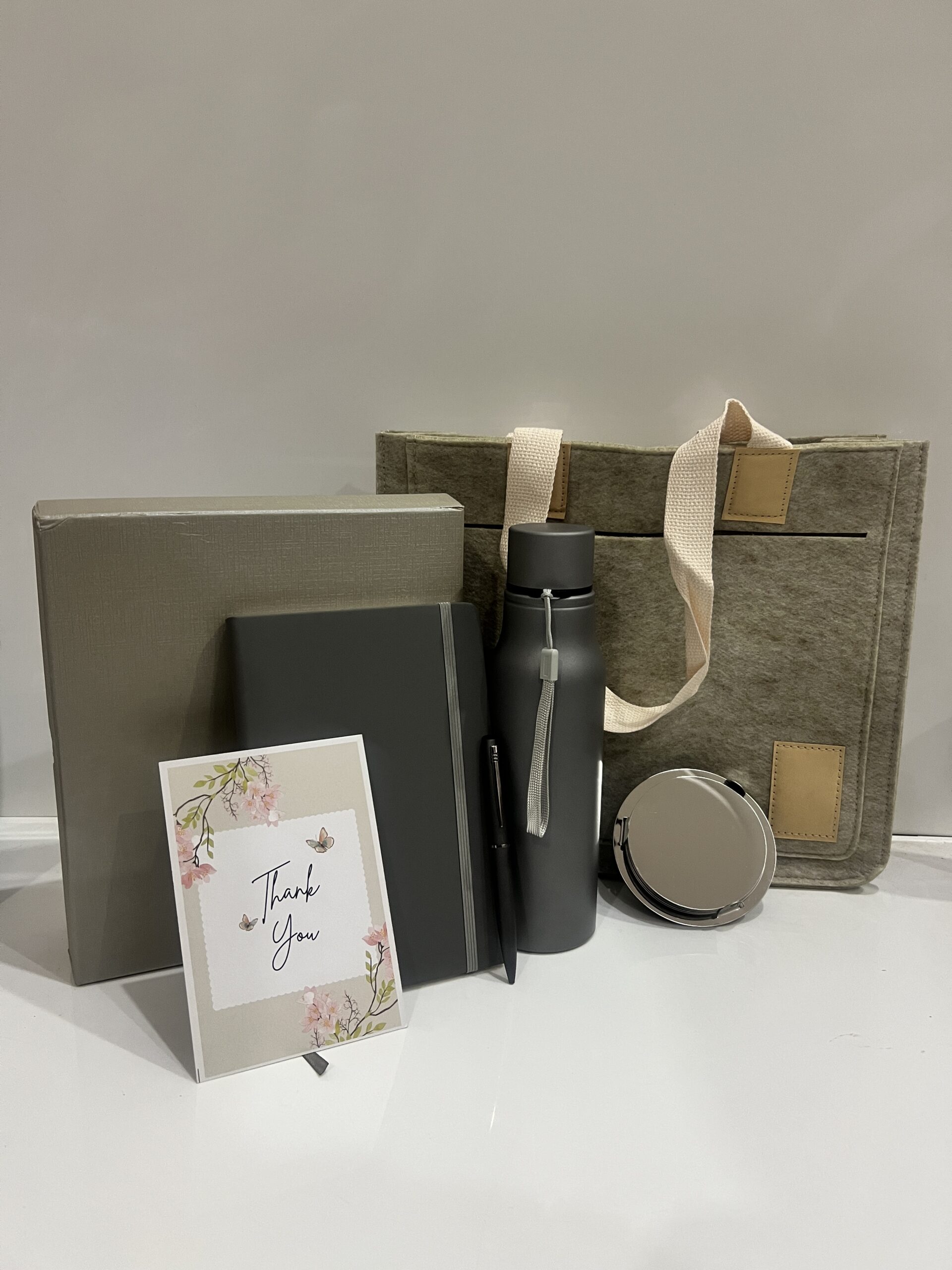 Elegant Grey Appreciation Corporate Hamper – Notebook, Pen, Steel Bottle, Desk Clock, Compact Mirror & Felt Tote