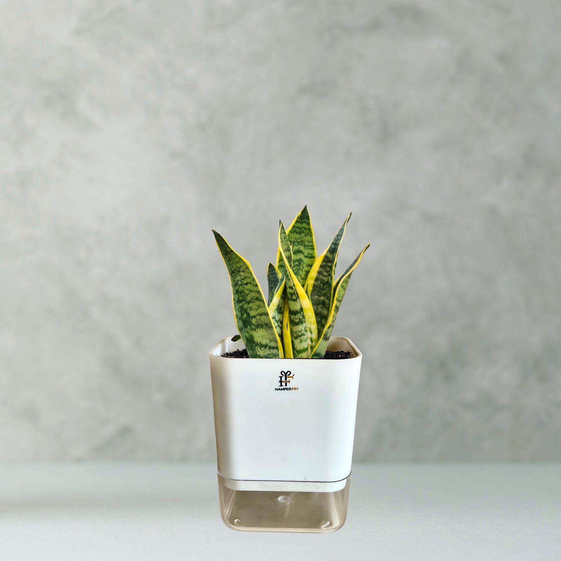 Golden Snake Plant in a self-watering planter with gift box. A low-maintenance lucky indoor plant ideal for desks, décor, and corporate gifting.