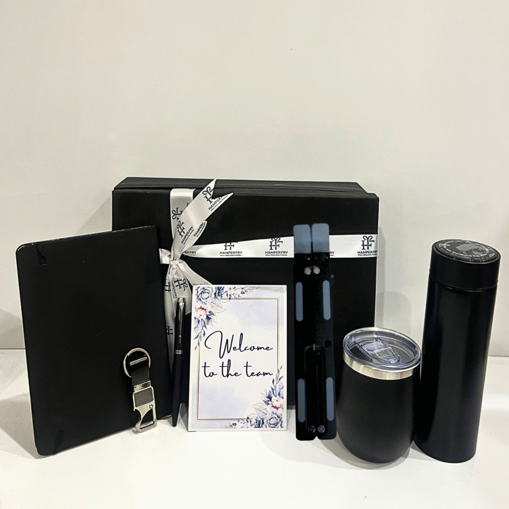 This premium gift set features a sleek notebook, a stylish black pen, and an insulated travel mug — the perfect trio for everyday professionals. Thoughtfully curated to blend utility with sophistication, it’s an ideal choice for corporate gifting, client appreciation, and onboarding hampers.