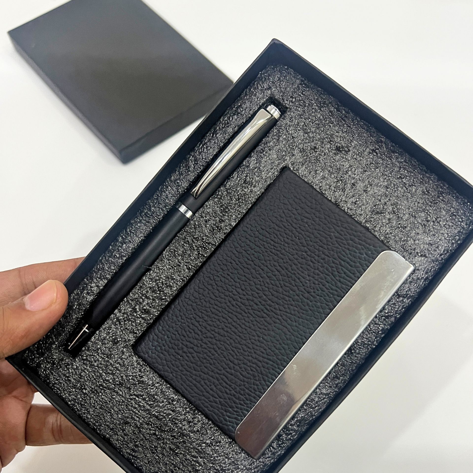 Elegance in simplicity — the Executive Duo Set brings together two essentials of professionalism: a premium metal pen and a sleek leather-finish card holder. Thoughtfully packed in a matte black box, this set is the perfect choice for corporate gifting and professional milestones.