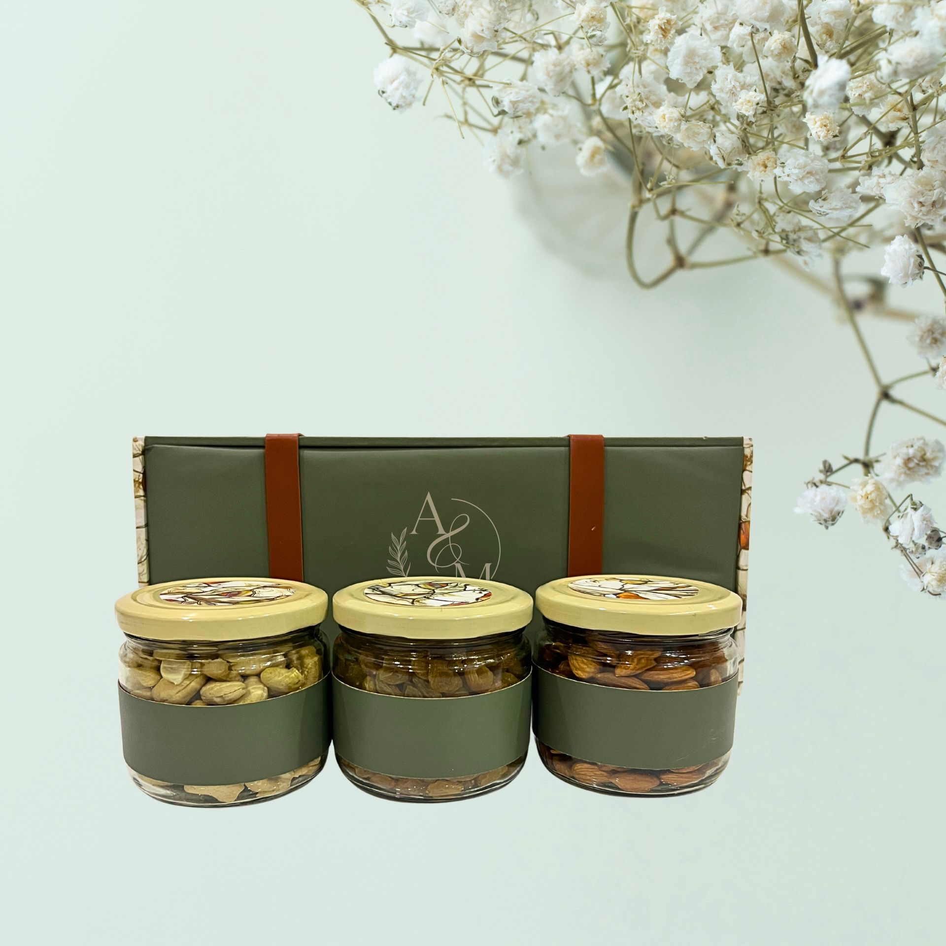 Our Olive Grace Hamper is curated for those who love minimal elegance — featuring a trio of premium dry fruits beautifully packed in a chic olive-green designer box with leather detailing. Perfect for couple gifting, wedding giveaways, or elegant festive favours, this hamper symbolises prosperity, wellness, and love in every bite.