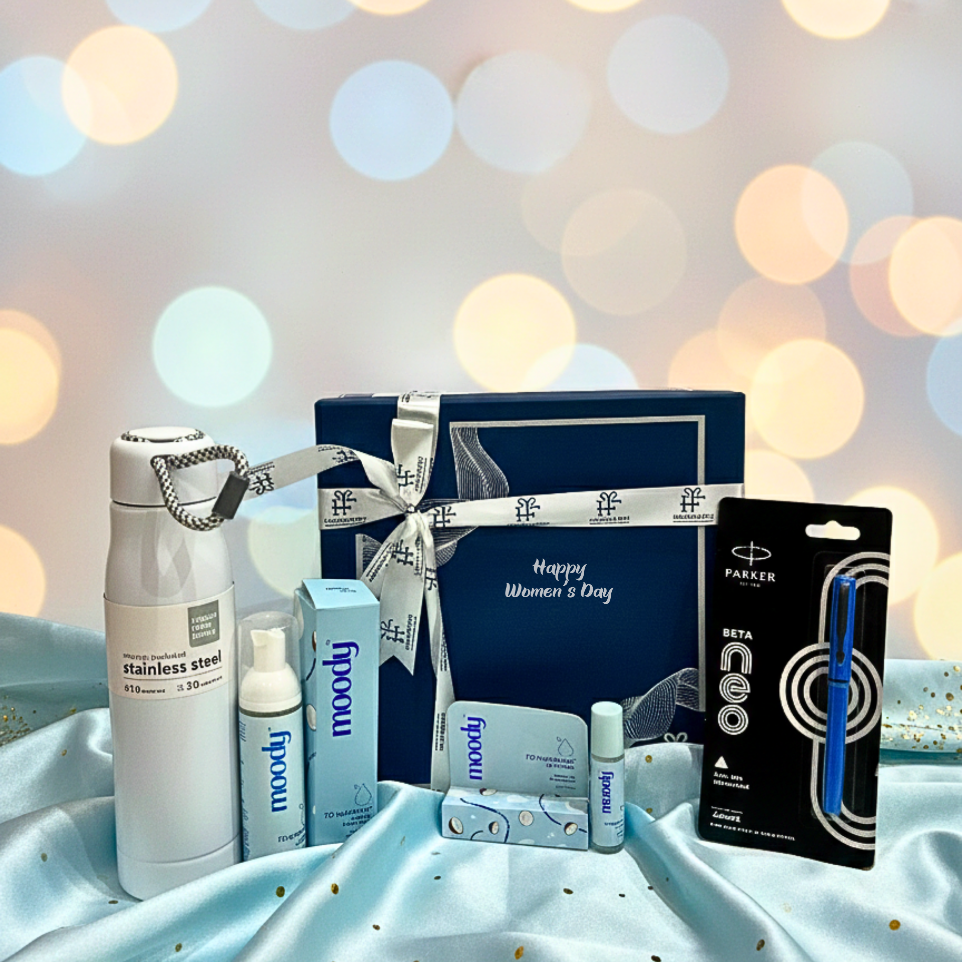 Women’s Day premium corporate gift hamper featuring a stainless steel bottle, Parker pen, Moody skincare essentials, and luxury gift box. Ideal for employee appreciation, corporate Women’s Day gifting, and professional wellness hampers.