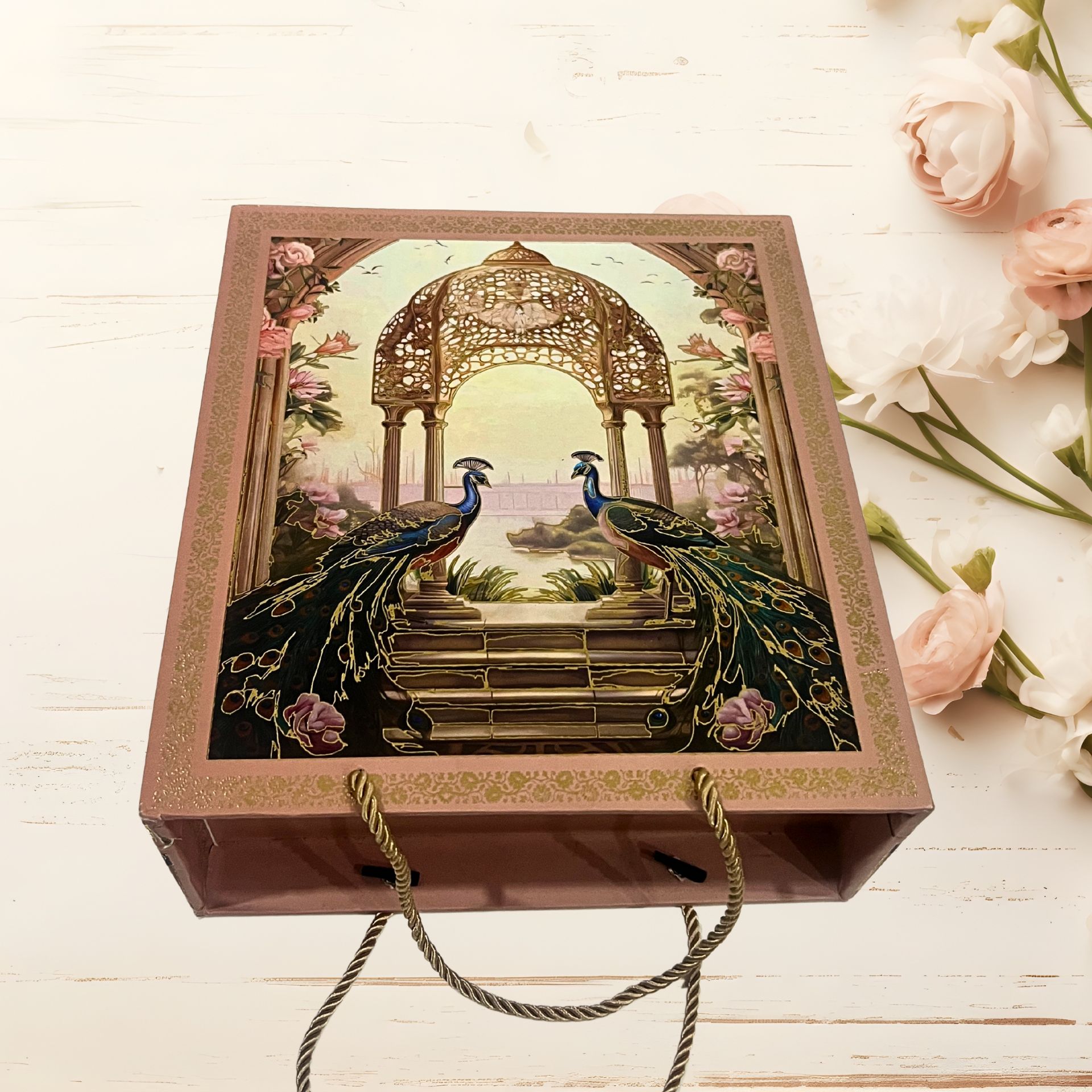 Encased in a royal blush box with intricate peacock artwork and satin interiors, this hamper holds four jars of premium dry fruits — symbolizing abundance, health, and prosperity. Each jar is beautifully adorned, making this gift a perfect blend of heritage and elegance.